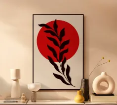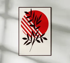 Quest'opera d'arte è caratterizzata da un audace sole rosso e da un ramo botanico scuro e fluente, che fonde forme geometriche e linee organiche. Il design si ispira all'estetica giapponese, fondendo il minimalismo giapponese e l'armonia scandinava. Il contrasto tra il nero profondo e il rosso vibrante e la crema morbida crea una composizione suggestiva e tranquilla. Perfetto per chi apprezza la natura, l'equilibrio e l'arte astratta senza tempo, questo pezzo dona un senso di calma ed eleganza a qualsiasi ambiente.