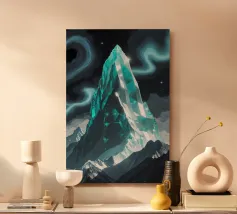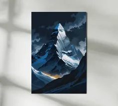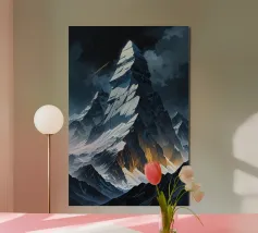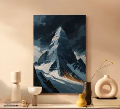 Questa rappresentazione del K2, di grande impatto visivo, utilizza audaci forme angolari che imitano i contorni geometrici di questa vetta imponente. Avvolta da un cielo scuro e tempestoso, la montagna attira l'attenzione con i suoi bordi frastagliati e le sue creste illuminate, creando un drammatico contrasto di luci e ombre. Gli accenti dorati lungo la base dei pendii aggiungono una dimensione suggestiva, simboleggiando un percorso attraverso il caos. Questo approccio artistico trasforma il K2 in un monumento astratto dell'inesorabile potenza e splendore della natura.