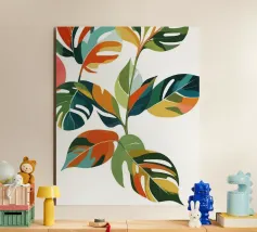 Questa vibrante opera d'arte presenta una composizione dinamica di foglie tropicali in colori audaci e contrastanti. L'opera presenta un mix di fogliame verde intenso, rosa tenue e arancione brillante, con intricati motivi di venature che aggiungono consistenza e dettagli. Il gioco di toni caldi e freddi crea un'atmosfera vivace ed energica, mentre lo sfondo pulito color crema permette alle foglie di risaltare in modo evidente. L'approccio grafico e stilizzato conferisce all'opera un'estetica moderna e giocosa, evocando la bellezza lussureggiante della natura in un design contemporaneo.