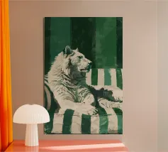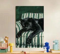 Un'opera d'arte serena e stravagante di un ghepardo che sonnecchia pacificamente su un divano vintage a righe bianche e verdi. I motivi vivaci e la postura accogliente del grosso felino creano un contrasto sognante e spiritoso tra la natura selvaggia e la rilassata vita domestica. Perfetto per gli amanti degli animali, i collezionisti d'arte eclettica e gli appassionati di estetica d'interni giocosa.