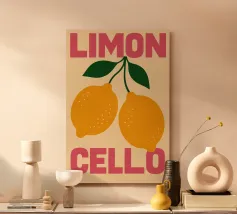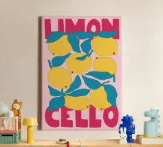 Questa stampa d'arte, vivace e rinfrescante, cattura lo spirito frizzante del liquore preferito dagli italiani. Il disegno presenta un motivo colorato di limoni stilizzati e foglie blu brillante su uno sfondo rosa. Le parole "LIMON" e "CELLO" sono rese in caratteri grandi e accattivanti, con la parola superiore in un giocoso rosa scuro e quella inferiore nella stessa tonalità. L'intera opera è disegnata a mano, in stile pop art, e trasmette un'atmosfera retrò e allegra. Questo poster digitale di alta qualità, con una risoluzione di 7000x5000 pixel e 300 dpi, porta un'esplosione di fascino solare e italiano e un tocco moderno in qualsiasi spazio.