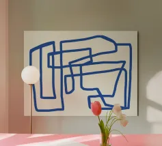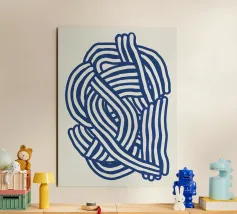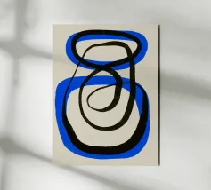 Una spessa linea blu serpeggia su uno sfondo neutro, creando un motivo astratto dalle forme audaci e curvilinee. La semplicità del disegno enfatizza il movimento e il flusso della linea continua.