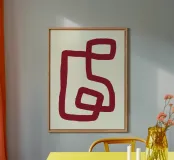 Un'audace linea rossa forma una forma astratta a incastro su uno sfondo color crema. La semplicità e la fluidità contrastano splendidamente con la scelta dei colori.