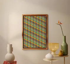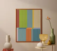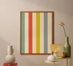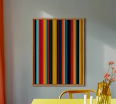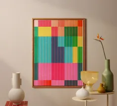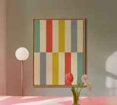 Un motivo geometrico di grande impatto, caratterizzato da sottili strisce verticali in tonalità vivaci di rosso scuro, blu, verde, rosa, giallo e arancione su un morbido sfondo beige. Questo disegno crea un dinamico effetto patchwork con un giocoso gioco di colori e un'estetica moderna di ispirazione Bauhaus. Perfetto per ravvivare l'arredamento della casa, gli accessori, l'abbigliamento e molto altro ancora, grazie al suo fascino pulito e contemporaneo e al vivace stile a righe!