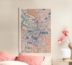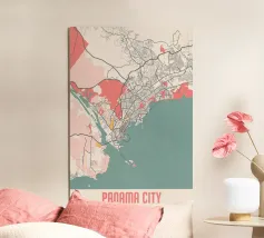 Una mappa artistica di Hong Kong che cattura l'armoniosa combinazione di paesaggio urbano e costa con strutture e colori chiari.