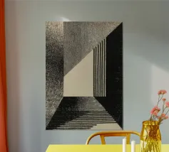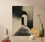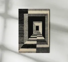 Incisione in bianco e nero di un arco con scale e un lungo sentiero curvo davanti ad esso. La texture ricorda un tappeto o un arazzo, le linee sottili creano riflessi di luce. Atmosfera misteriosa e invitante, come se il sentiero conducesse a un altro mondo.