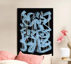 Vivaci pennellate rosa formano forme ad anello su uno sfondo di vernice blu pallido su un fondale nero. Gocce di vernice bianca scendono dagli accumuli di colore più spessi, dando un senso di movimento alla composizione.