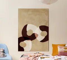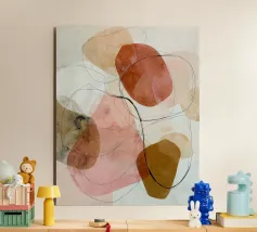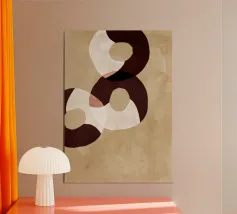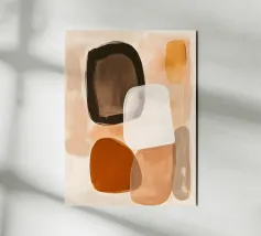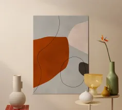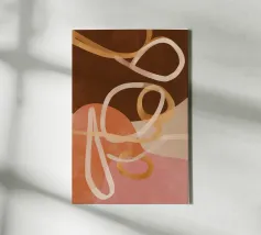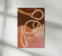 Un viaggio astratto attraverso linee fluide e forme terrose: questa composizione gioca con curve morbide, tonalità calde di terracotta, terra di Siena, fard e nudo per evocare un senso di movimento radicato. Ideale per interni moderni che cercano un tocco di pacato espressionismo.