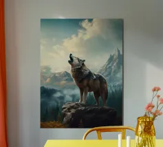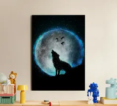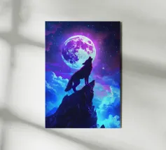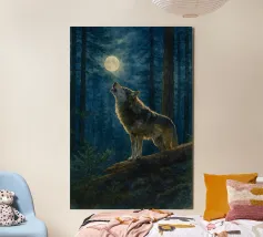 Una splendida illustrazione in stile cartoon di un maestoso lupo argentato che ulula alla luna crescente sotto un cielo stellato. Il lupo, con la sua pelliccia scintillante, si erge fiero su una sporgenza rocciosa, illuminata dalla luce della luna. La scena è ambientata in un cielo blu e nero profondo, pieno di stelle scintillanti, che evoca un senso di magia e serenità. La luna crescente brilla dolcemente, completando la presenza eterea del lupo. Alberi ombrosi e colline lontane completano l'atmosfera tranquilla e mistica.