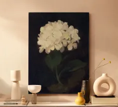 Mano che regge un fiore bianco in una luce soffusa con alluminio dibond