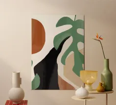L'immagine presenta un'illustrazione astratta con una grande foglia di monstera nera e il contorno di una mano. Lo sfondo è costituito da forme morbide e fluide nei toni del beige e del marrone, che creano un'atmosfera armoniosa e organica.