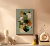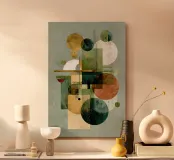Una danza astratta di cerchi e rettangoli di ispirazione Bauhaus nei colori verde matcha, crema tenue, ocra caldo e ruggine intenso. Questa composizione geometrica evoca il rituale dell'equilibrio, come la stratificazione di sapori in una bevanda artigianale o l'architettura della chiarezza nel design. Una dichiarazione perfetta per spazi moderni, minimalisti o in stile metà secolo.