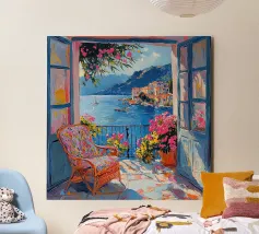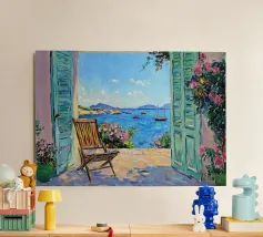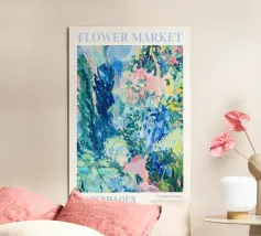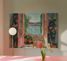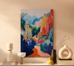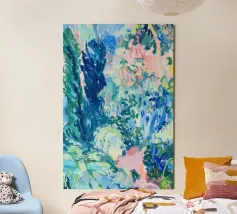 Un sentiero che attraversa un giardino all'inglese, circondato da una vegetazione vivace e da fiori sbocciati nei toni del rosa, del viola, del blu, del giallo e del verde acqua, dipinti con audaci pennellate di pittura acrilica, creando una scena vibrante e colorata che ricorda lo stile di Matisse. I colori sono brillanti e saturi e aggiungono profondità alla composizione, mentre le ombre morbide aggiungono dimensione a elementi come alberi, fogliame, cespugli e rocce. Questo dipinto evoca gioia e giocosità, creando un effetto allegro.