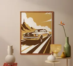Una ripresa cinematografica perfettamente composta di una Ford Mustang Fastback nera opaca che solleva la polvere mentre sfreccia su un'autostrada deserta illuminata dal sole. Il bagliore dorato del tramonto contrasta con la vernice nera profonda, enfatizzando le linee eleganti e aggressive di questa leggendaria muscle car. I larghi pneumatici della Mustang aderiscono alla strada accidentata mentre il suo motore V8 ruggisce, emanando una potenza grezza che definisce l'essenza della cultura automobilistica americana. Il paesaggio circostante, fatto di sabbia e montagne lontane, contribuisce a creare un'atmosfera selvaggia e libera.
