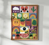 Un motivo allegro e giocoso di varie icone simpatiche e colorate, tra cui arcobaleni, cactus, occhi e frutta. Il mix eclettico crea un disegno divertente, energico e stravagante.