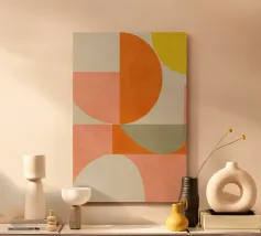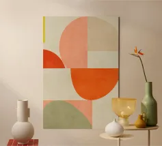 Composizione minimalista di metà secolo con forme geometriche semplici e colori accoglienti, tra cui arancione, marrone, beige e verde acqua, che evocano l'evoluzione del sole in una luminosa giornata autunnale. Con i suoi toni caldi, quest'opera d'arte retrò è in grado di ravvivare qualsiasi ambiente. Una scelta perfetta per case, uffici e hotel. Parte di un duo.