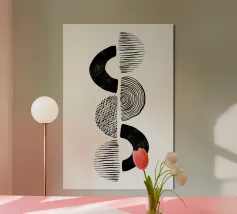 Il design pulito incontra la tensione visiva: questo motivo minimalista in bianco e nero combina forme geometriche come semicerchi, rombi e griglie di linee per creare un'opera d'arte moderna. Ideale come poster, cuscino, maglietta o murale - perfetto per gli amanti del Bauhaus, della metà del secolo e dei design monocromatici.