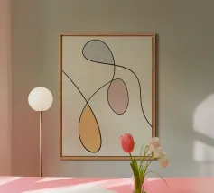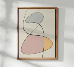 Un insieme di forme astratte nei toni della terra sovrapposte a linee sottili e scure crea un design moderno e minimalista. La composizione è calma ed equilibrata e l'uso dello spazio negativo contribuisce alla semplicità complessiva.