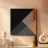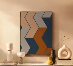 Forme geometriche astratte formano una composizione con audaci linee diagonali che si intersecano in vari angoli. La tavolozza è composta da toni tenui, tra cui nero, grigio, beige e ruggine.
