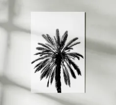 Questo motivo minimalista a forma di palma in bianco e nero dona serenità tropicale a qualsiasi ambiente. La palma solitaria su uno sfondo chiaro trasmette una sensazione di libertà e di estate e si adatta perfettamente a un arredamento moderno e minimalista. Ideale come murale, cuscino o cover per cellulare, questo disegno aggiunge un tocco di esotismo e relax a qualsiasi stanza. Per tutti coloro che desiderano un'atmosfera tropicale nella propria casa e apprezzano la semplice eleganza.