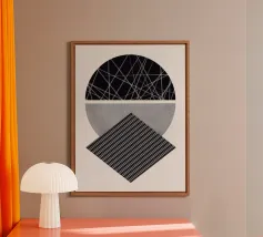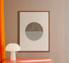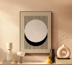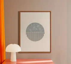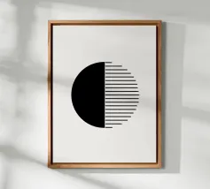 Opera d'arte geometrica minimalista con linee nere e una forma rotonda in verde salvia e texture su sfondo beige.
