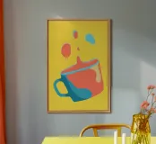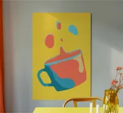 Una vibrante collisione di colori e forme, questa opera d'arte digitale minimalista cattura il caos giocoso di una tazza inclinata a metà. Su uno sfondo giallo dopamina, il design ispirato alla pop-art mescola corallo, verde acqua e toni pastello in un pezzo visivamente incisivo, ideale per dare energia a cucine moderne, angoli caffè o spazi creativi eccentrici.