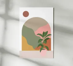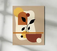 Il design minimalista è caratterizzato da una semplice pianta in vaso con foglie scure, contrapposta a forme astratte e sovrapposte nei toni terrosi del rosso, del grigio e del bianco. Le linee pulite e i blocchi di colore decisi creano un'estetica moderna e rilassante.