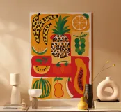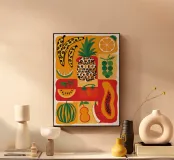 Una composizione vivace e generosa di vari frutti tropicali stilizzati come ananas, papaya e anguria. L'opera d'arte è una celebrazione colorata e gioiosa delle dolci offerte esotiche della natura.