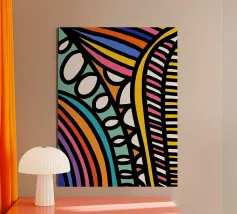 Una varietà di linee spesse e sottili si incrociano e si sovrappongono su uno sfondo chiaro, creando un disegno intricato. Segmenti colorati nei toni del blu, del verde, del giallo e del viola aggiungono un vibrante contrasto alle linee nere.