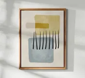 Arte digitale astratta con linee, forme organiche e geometriche con texture e pennellate nere in morbide tonalità pastello di marrone, ocra, blu e beige. Arte moderna per interni essenziali, scandinavi, bohémien e boho. Godetevi l'arte digitale minimalista con forme e linee morbide.