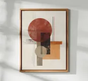 Un'audace opera d'arte astratta con cerchi, rettangoli e linee sottili in rosso ruggine, nero, beige e arancione. La finitura strutturata conferisce un tocco vintage, rendendola ideale per interni moderni, boho o di metà secolo.