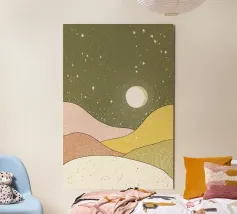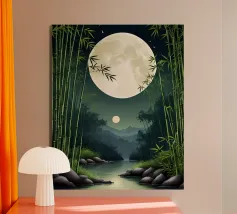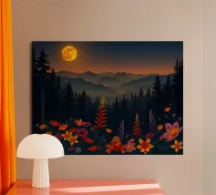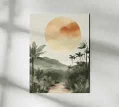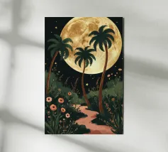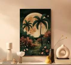 Un'ipnotica scena notturna con palme lussureggianti immerse nel bagliore di una luna piena sovradimensionata. Il verde intenso contrasta meravigliosamente con il cielo notturno, mentre i fiori delicati sbocciano sotto la luce celeste. La scena cattura una qualità onirica, fondendo la bellezza naturale con un'atmosfera eterea, quasi surreale. I toni caldi della luna creano un contrasto sorprendente con i verdi profondi e i rosa tenui dell'ambiente floreale. Quest'opera d'arte evoca tranquillità e meraviglia, rendendola un pezzo ideale per gli amanti dei paesaggi celesti.