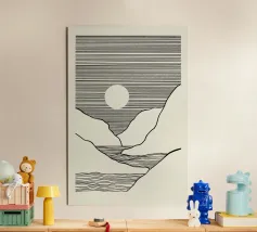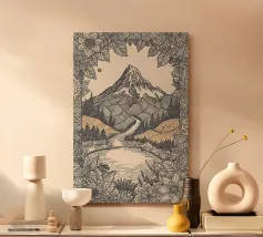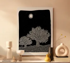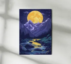 Questa stampa in bianco e nero in stile linoleografia ritrae un ipnotico paesaggio notturno. Una luna piena splendente domina il cielo stellato, proiettando la luce su un fiume tortuoso che scorre tra montagne aspre e strutturate. L'intricato lavoro al tratto crea un senso di movimento e profondità, evocando mistero e tranquillità.