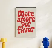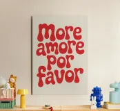 La scritta "More Amore Por Favor" appare in rosso brillante su uno sfondo color crema. Le lettere rotonde e giocose in un font sans-serif grassetto conferiscono al design un aspetto caldo e moderno. Un poster tipografico minimalista pieno di fascino ed energia positiva.