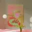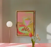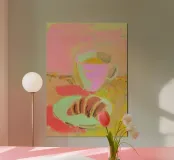 Natura morta colorata con una tazza rosa riempita di liquido giallo su una superficie gialla. Un piatto verde chiaro con accanto biscotti marroni e ricurvi. Sfondo rosa e giallo con pennellate visibili per un'opera d'arte vivace e moderna.
