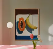Una natura morta realistica ma stilizzata di una papaya e una banana su una superficie bianca, immersa in una forte luce solare diretta. Il gioco di luci e ombre lunghe crea una composizione drammatica e moderna.