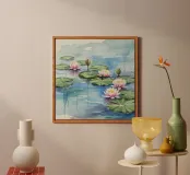 Questo splendido acquerello cattura l'essenza pacifica di uno stagno illuminato dal sole e ornato da delicate ninfee. I fiori bianchi e rosa fluttuano con grazia sull'acqua blu, calma e riflettente, circondati da ampie ninfee verdi. Le delicate pennellate e l'armoniosa miscela di colori evocano un senso di tranquillità e bellezza naturale, rendendolo un pezzo perfetto per chiunque voglia aggiungere un tocco di serenità alla propria casa. Quest'opera d'arte è una celebrazione della semplice eleganza della natura e dei momenti di tranquillità che si possono trovare in uno stagno da giardino.
