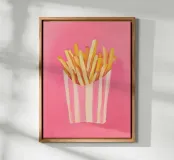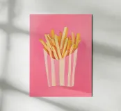 Questa affascinante illustrazione di patatine fritte in una scatola a righe pastello cattura l'aspetto nostalgico e retrò del popolare snack. Con pennellate morbide e un'armoniosa tavolozza di colori rosa, l'opera trasmette una cultura alimentare giocosa e trasforma il fast food in arte culinaria creativa.