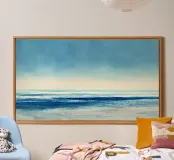 Un tranquillo paesaggio marino reso con lavaggi stratificati di ceruleo e blu oltremare. Il morbido gradiente di cielo e acqua si fonde in una linea lontana, evocando quiete e chiarezza. Questo studio costiero minimalista cattura la tranquilla poesia della luce e dei riflessi su un orizzonte infinito.
