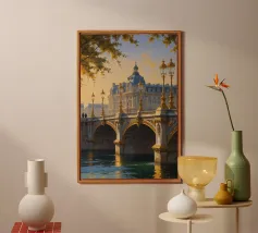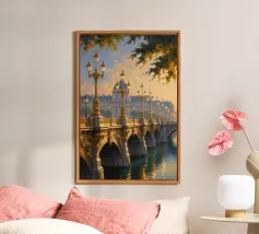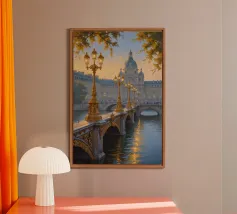 Un'accattivante rappresentazione impressionista della Torre Eiffel che si erge sopra il ponte d'oro ornato da intricate sculture e antichi lampioni. I riflessi vibranti del fiume Senna, di colore verde smeraldo, danno vita al dipinto. Il cielo azzurro, sfiorato da delicate nuvole, accresce il fascino di questa scena parigina per eccellenza. Il connubio tra i dettagli architettonici e la tranquillità naturale del fiume crea una visione armoniosa e pittoresca della Città della Luce.