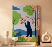 Godetevi la bellezza della natura selvaggia con questa illustrazione di un orso che raccoglie frutta in una tranquilla foresta. I colori vivaci e il design minimalista creano un'atmosfera pacifica e rasserenante.