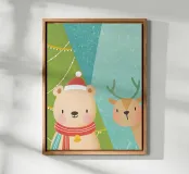 Allegra illustrazione con un orso e un cervo che indossano abiti natalizi accanto a un albero di Natale, irradiando allegria e felicità nel giorno di Natale.