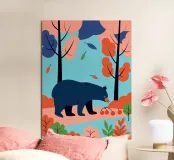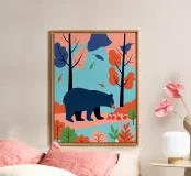 Godetevi la bellezza naturale di una foresta autunnale con questa illustrazione di un orso in cerca di cibo. I colori caldi e il design minimalista creano un'atmosfera pacifica e rasserenante.