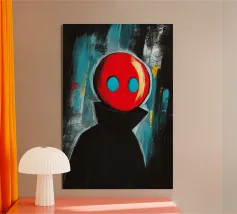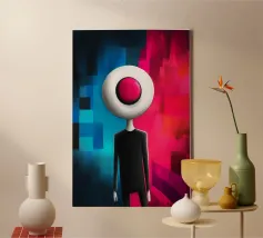 Un surreale guardiano del mondo digitale: la figura umanoide con un gigantesco occhio al posto della testa si trova tra mondi cromatici vibranti di blu profondo e rosso intenso. I motivi geometrici sullo sfondo ricordano la frammentazione digitale, mentre il corpo nero e vuoto della figura suggerisce un essere misterioso, quasi soprannaturale. Si tratta di un osservatore onniveggente o di un'anima persa nell'infinito flusso di dati?