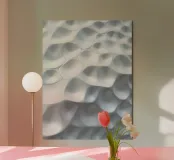 Questo pezzo cattura un ipnotico disegno astratto tridimensionale, caratterizzato da una superficie dinamica di forme organiche e biomorfe. Le forme bianche e perlacee sembrano incresparsi e fluire, creando un motivo rilassante ma complesso che ricorda le bolle, le cellule o un paesaggio fluido e futuristico. Il sottile gioco di luci e ombre sulle curve scolpite mette in evidenza la profondità e la consistenza, dando l'impressione di una forma viva e pulsante. L'estetica pulita e moderna lo rende un pezzo versatile per gli spazi contemporanei, aggiungendo un elemento di sofisticata eleganza e interesse visivo a qualsiasi ambiente.