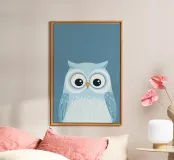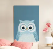 Un'affascinante illustrazione di un gufo curioso che osserva le stelle, circondato da uno sfondo morbido e sognante. Gli occhi sovradimensionati e le piume delicate creano un'atmosfera stravagante e serena. Questo disegno giocoso ma tranquillo invita a un senso di meraviglia e curiosità, perfetto per aggiungere un tocco di magia e tranquillità a qualsiasi spazio.