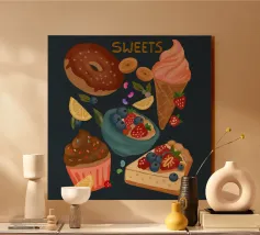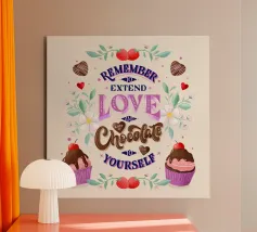 Una citazione divertente con tanta frutta disegnata a mano per la cucina o la zona pranzo. Pace, amore e yogurt gelato. Un motivo tipografico davvero unico. Le lettere sono disegnate a mano e colorate con i freschi e rinfrescanti colori del gelato. La cornice è formata da frutti come mirtilli, kiwi, fragole, mango, lamponi e fiori di vaniglia. È anche un disegno molto bello e adatto per un dolce caffè, per una gelateria, per un grazioso bistrot o ristorante.