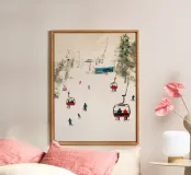 Un vivace motivo invernale: gli sciatori scivolano sulla pista mentre gli impianti di risalita rossi fluttuano nel paesaggio innevato. Con i suoi colori chiari e lo stile moderno, questo disegno porta il dinamismo sportivo e il fascino alpino in ogni casa. Perfetto per murales, tazze, cuscini o tessuti: un regalo ideale per gli appassionati di sci e gli amanti dell'inverno.