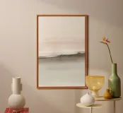 Aggiungete un tocco di serenità al vostro spazio con questo paesaggio astratto ad acquerello dipinto a mano nei toni tenui della terra. Perfetto per creare un'atmosfera accogliente di ispirazione scandinava in autunno. Arricchite l'arredamento della vostra casa con questo pezzo pacifico e tranquillo.