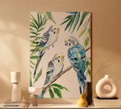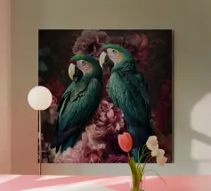 Due pappagallini si accoccolano l'uno all'altro su un'amaca in mezzo al verde. Le loro teste sono leggermente inclinate, come se sussurrassero segretamente che, dopo tutto, questo รจ davvero il posto migliore del mondo. Perfetto per chiunque voglia portare un po' di allegria e amore nella propria casa.